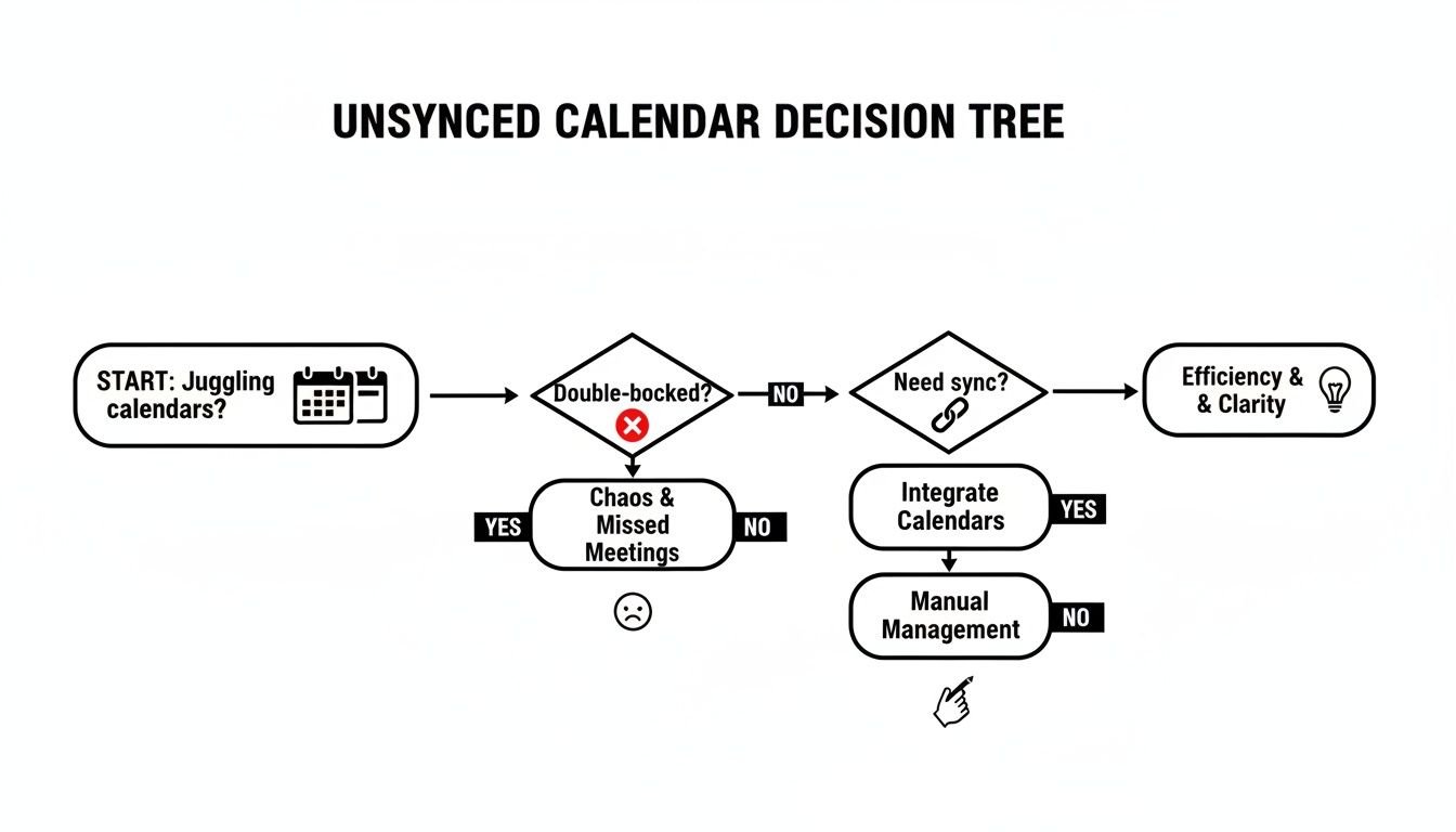 This flowchart nails the issue perfectly: juggling separate calendars almost always leads to scheduling headaches. Let's break down which approach will actually solve the problem for you.